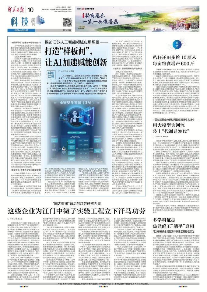 2026年1月21日,《新华日报》以《探访江苏人工智能领域应用场景——打造“样板间”, 让AI加速赋能创新》为题,报道了好博体育等入选江苏省“前沿技术应用场景建设示范名单”企业,在应用场景建设方面的实践与成效。